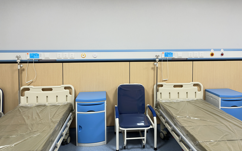 山東魯南醫(yī)院東區(qū)新安裝中心供氧系統(tǒng)和負(fù)壓吸引系統(tǒng),在一層設(shè)有獨(dú)立的中心供氧站和負(fù)壓吸引泵組,病房每個(gè)床位設(shè)立液晶顯示信息化呼叫器、閱讀燈、電源插座、吸引和氧氣德標(biāo)DIN終端接口。