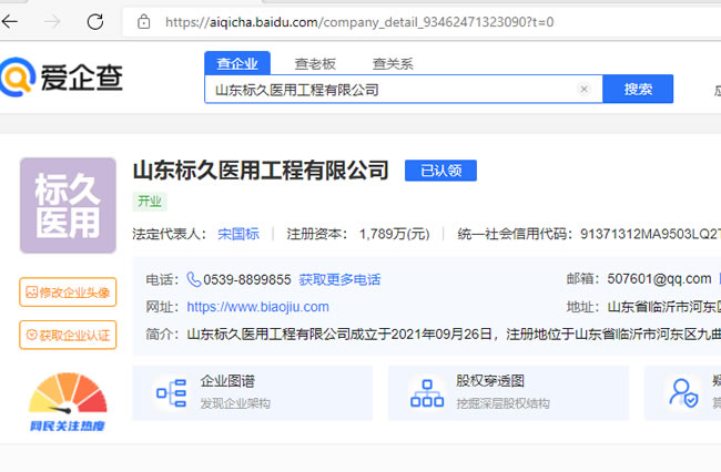 2、通過愛企查網站可以查看其公司是否具有醫(yī)療器械經營許可或第二類醫(yī)療器械經營備案證,具有以上證件的就符合醫(yī)療器械及醫(yī)用中心供氧系統(tǒng)設備的銷售、批發(fā)經營權。